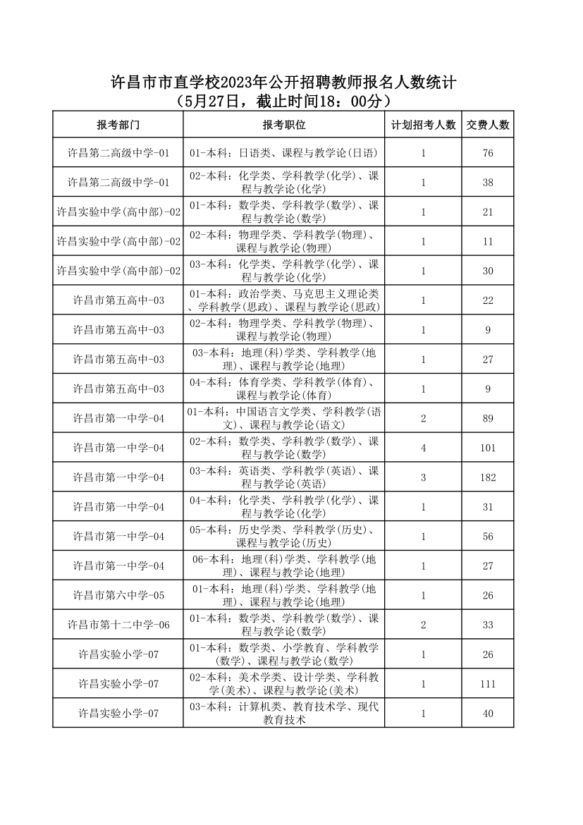 【统计】许昌市市直学校2023年公开招聘教师报名人数统计(5月27日,截止时间18:00分)